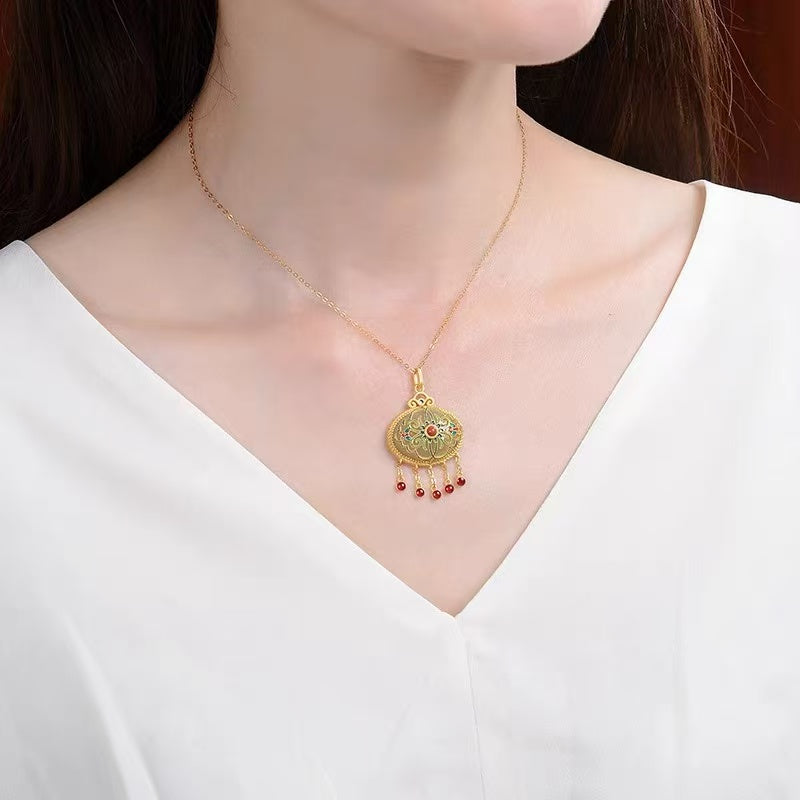 Jade pendants are more than ornaments—they're spiritual protectors and symbols of virtue. The Hetian Jade eclipse pendant is encaged within the enameled silver filigrees. This design combination represents the solemnity and gracefulness of imperial court women. A perfect gift for mothers, wives, and all loved women.